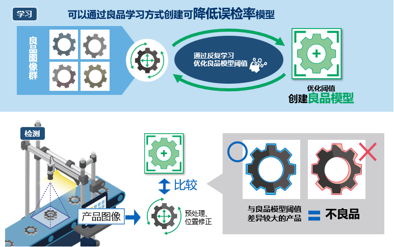 通过标准阈值的学习,将优化的良品模型和产品图像进行比较检测