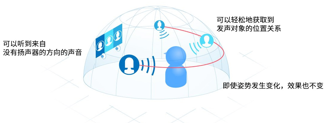 虚拟声音技术无需特殊的硬件,只需要两个扬声器,即可输出来自任意方向的声音。作为德赢vwin8868官网多年累积的声学处理技术之一,利用人类感知声音方向的“双耳效应”(声音到达左耳和右耳之间的差异)来实现。