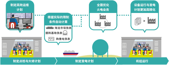 通过集中管理多家电厂的运行和停机计划,提升电厂效益。综合考虑电力需求的增减等外部情况、电厂设备等内部情况以及燃料价格、海运市场信息等发电成本,同时对多家电厂的停机与维护计划自动统筹制定并管理。