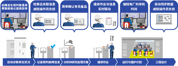 在发生故障前通过监测发现故障征兆并发出通知。事先记录有故障征兆的位置和内容,结合相关的图纸和零部件信息,实时掌握维修作业的进展,这在以前是一项极其繁琐的工作,但现在却可以预判故障,并调配零部件。同时,根据发电计划,配合机组停机时间制定并执行维修计划,可以大幅度地缩短电厂的停机时间。由此为电厂的运行管理提供了合理的解决方案。