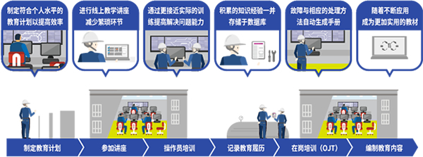 自动收集发生的实际故障及问题,制定与员工个人水平相符的教育计划,编制教育内容。实际故障及相应的处理方法被分类分组记录下来,可以自动生成培训手册,留存宝贵知识经验。利用实际案例,配合线上教学讲座(e-learning)、模拟训练、在岗培训(OJT)这三种学习方法,增加实务经验,提升业务水平。