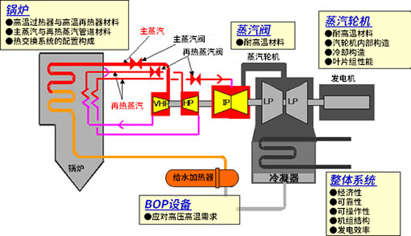 为了实现A-USC的实用化,德赢vwin8868官网正在开展各项研发工作,包括可耐受700℃蒸汽高温的材料开发、以及能带来更好的稳定性和经济性的系统及结构方面的改良。