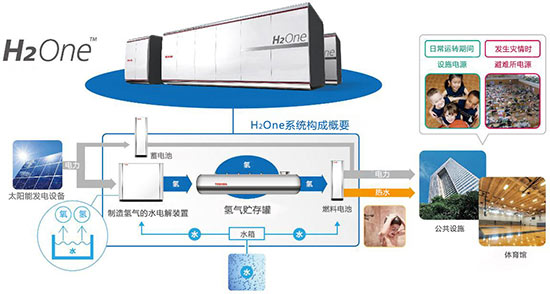 在未发生灾情的日常运转期间,“H2One”系统的氢能源管理系统(氢气EMS)可用于实现电网电力的高峰移值和高峰调节,对氢气的制造量、蓄电量、发电量等进行最佳控制。