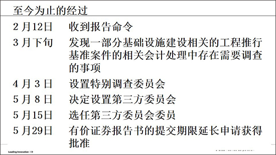 | 2015年3月下旬 | 在为应对披露检查就工程推行基准案件指出的问题而进行的自我调查的过程中,发现本公司2013年度部分基础设施相关的工程推行基准案件的会计处理存在需要调查的事项。 |