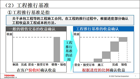 会计基准中,原则上将客户验收时作为确认收益的时间点。另外,工程合同,接受订单生产软件等合同则根据进度比例来确认收益。这就是工程推行基准。