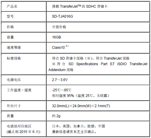 据悉,此产品是全球第一款使用TransferJetTM技术规格的SD存储卡。用户将其插入数码相机后,只需靠近支持TransferJetTM的智能手机、平板电脑、PC等设备,就能实现高速传输所拍摄的照片与视频注5。