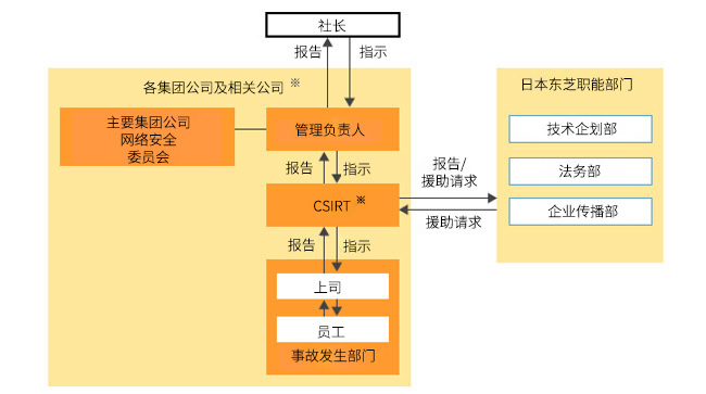 员工意识到发生公司信息泄露等事件,或判断有可能发生时,会立即通知“CSIRT”。收到报告的“CSIRT”将采取必要的措施,例如:调查原因,研讨对策,预防再次发生等。此外,发生可能违反法令等的重大机密泄露事件时,或可能发生这类事件时,根据相关法令,与相关部门进行协商后,采取对外公布等应对措施。
