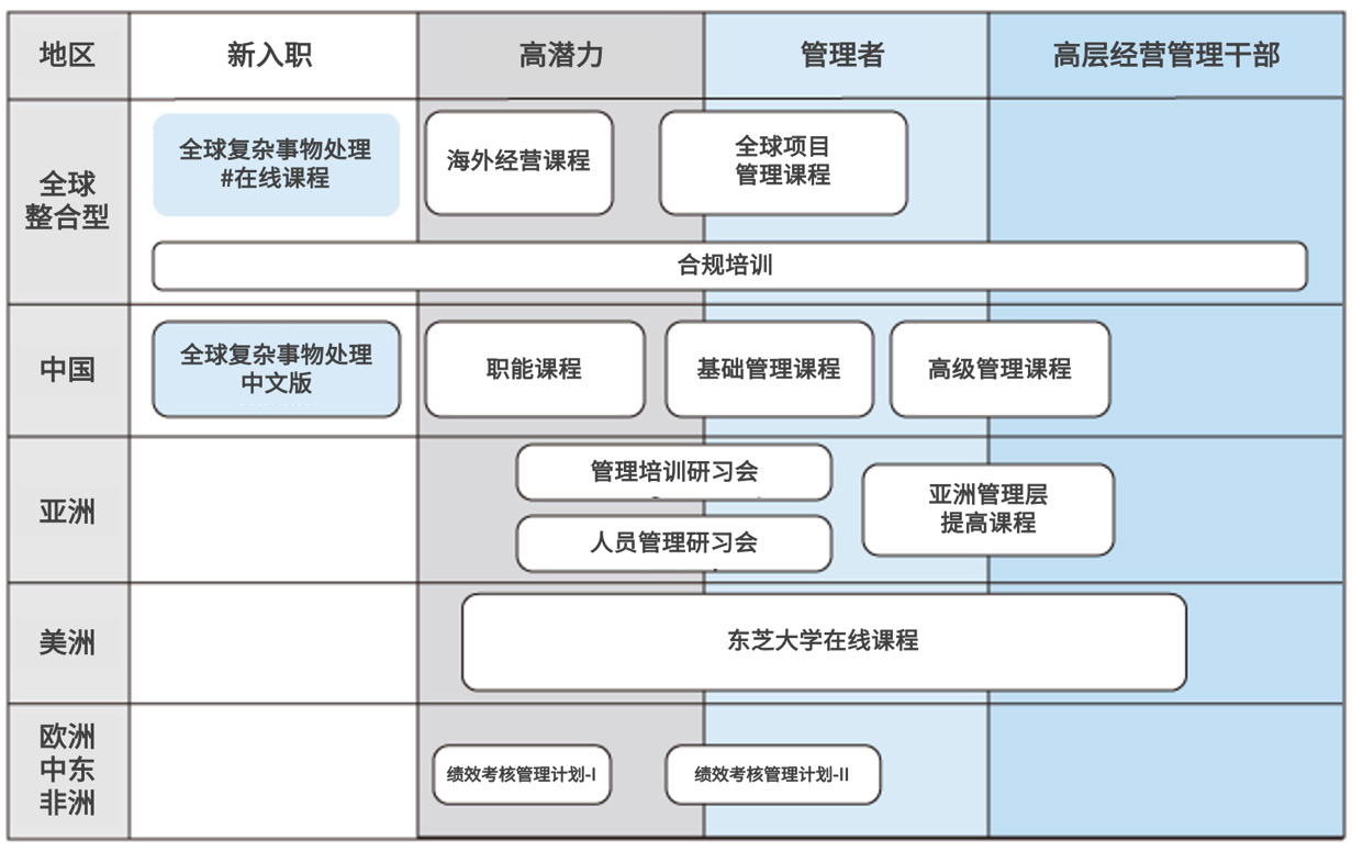 | 阶段性培训 | 面向被任命新职务(领导、管理人员等)的员工提供阶段性培训,目的是学习担任新职务所需的基础知识和技能,提高相应管理能力。此外,还包括持续提高主管人员管理能力的培训、帮助员工提前掌握国际业务所需的知识和技能的教育培训。 |