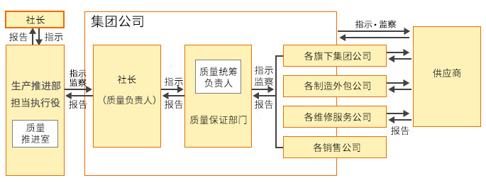 德赢vwin8868官网集团质量保证活动的实施推进体制是:由“生产推进部担当执行役”和“质量推进室”对集团进行统一管理,由集团公司负责人对其公司每个产品、每项服务负责。从产品企划、开发、生产到废弃、再资源化,在整个产品生命周期都注重提升产品质量,由各主要的集团公司的“质量统筹负责人”对所管辖的日本国内外事业所(制造基地)、供应商、维护服务公司、制造外包公司进行指导与监督检查。