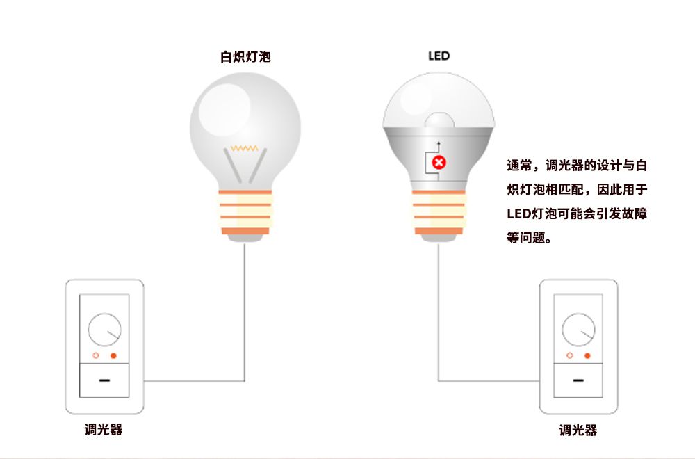 当白炽灯泡与调光器组合时,可适当调暗亮度以使其感觉“不黑但是足够暗”。 但LED灯泡控制输出的电流量很小并且非常难控制。