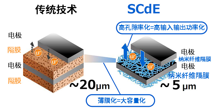 除NTO外,德赢vwin8868官网为了推进SCiB?的发展还引进了一项新技术——Skin-Coated Electrode(SCdE)。SCdE是一种新型隔膜结构,是指覆盖在电极材料表面上、由树脂制成的超薄纳米纤维膜,可以分隔阴阳两极。通常,这种阴正极绝缘的隔膜采用厚度约为20μm的独立膜。而德赢vwin8868官网采用的是独有的电极一体化隔膜,可成功将薄膜厚度减至5μm左右。